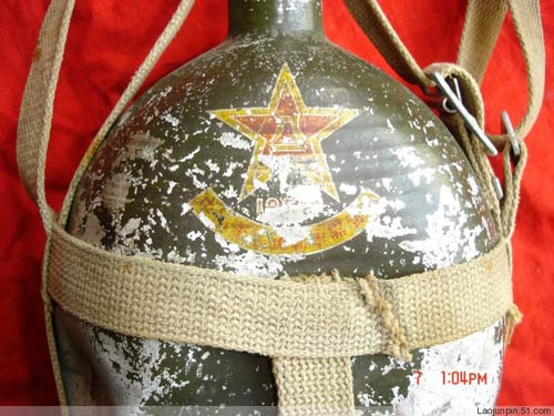 新中國成立初期,我軍使用的水壺多為從國民黨手中接管的后勤工廠中生產(chǎn)的產(chǎn)品,其形式與日式水壺相似,壺身采用鋁制材料,由軟木作為壺塞,用帆布帶從壺兩側(cè)固定,攜行方式采用可調(diào)帆布背帶,有的壺身外側(cè)還印有八一軍徽,但此種水壺壺壁薄,外層涂漆也不牢固,在行軍作戰(zhàn)時,易受磕碰變形;使用過一段時間的軟木壺塞易變形漏水,當(dāng)壺里裝滿水做劇烈動作時,會弄濕攜帶者的衣服,如裝的是開水還會導(dǎo)致燙傷。以后,壺塞由軟木改為酚醛塑料螺紋蓋,增強(qiáng)了密封性。也因此成為了當(dāng)時我國勞動人民最便于攜帶的實用配飾。
