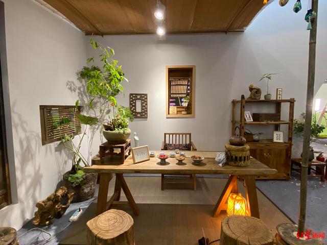 走進籬里外外展位,仿佛偶然踏入童年的小院。巨大原木制成的長條桌,充滿禪意的邊幾,溫暖的老式火爐……